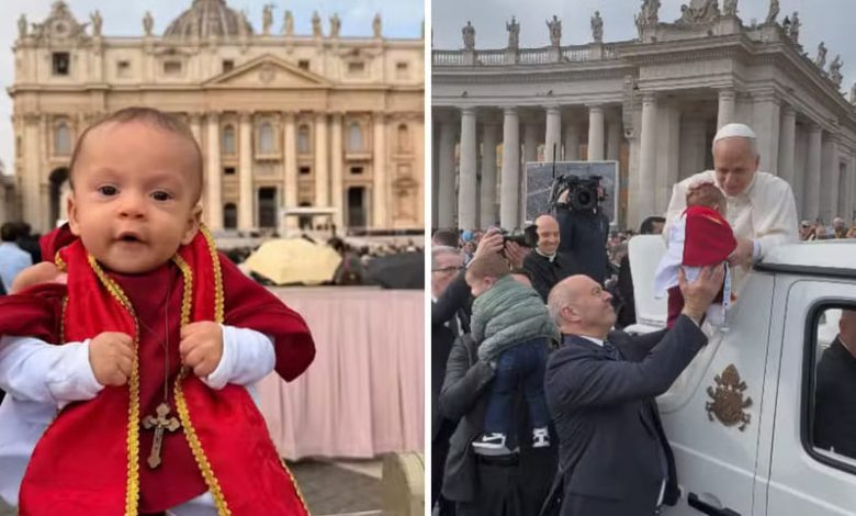 Matheus afirma que conseguir ser notado por Leão XIV foi “uma providência divina”, mas confessa que o fato de o bebê estar vestido como papa ajudou a chamar mais atenção do pontífice.